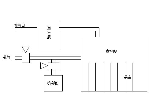 أولاً، يتم تشغيل مضخة التفريغ لبدء عملية التفريغ. بمجرد أن يصل مستوى الفراغ في الغرفة إلى القيمة المحددة (يمكن ضبط هذه القيمة عن طريق تغيير قيمة P2 على مقياس الفراغ، راجع دليل مقياس الفراغ)، يتم إدخال النيتروجين. بعد الوصول إلى مستوى الفراغ المحدد (يمكن ضبط هذه القيمة عن طريق تغيير قيمة P1 على مقياس الفراغ)، يتم تكرار عملية التفريغ وإدخال النيتروجين. بعد الوصول إلى العدد المحدد من إدخالات النيتروجين، تبدأ عملية التنظيف بالمكنسة الكهربائية مرة أخرى، يليها إدخال المحلول الكيميائي. بعد الوقت المحدد، يتوقف إدخال المحلول الكيميائي، وتبدأ مرحلة التثبيت. بعد وقت الانتظار المحدد، تبدأ عملية التنظيف بالمكنسة الكهربائية وإدخال النيتروجين مرة أخرى، لعدد محدد من الدورات. بمجرد أن يكمل النظام العملية تلقائيًا، يتم إصدار إنذار صوتي ومرئي، يشير إلى أن الرقائق جاهزة للإزالة.