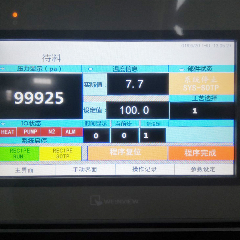 | وصف عملية تشغيل المعدات | تستخدم المعدات برمجة التحكم الصناعي PLC. يشمل التحكم القابل للبرمجة حالة بدء/إيقاف مضخة التفريغ، وإعداد مستوى التفريغ، ومدة الاحتفاظ بالفراغ، ووقت تعبئة الغاز الخامل، ووقت إغلاق صمام الملف اللولبي للغاز الخامل، وبدء/إنهاء دورة التسخين. | ||